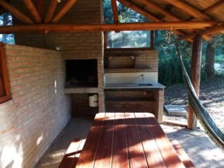 ·)Parrillero cubierto bajo el quincho, con mesada de granito y bacha de cocina, mesa y bancos para 6 personas.